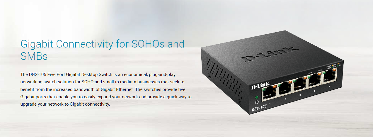 سوئیچ شبکه دسکتاپ پنج پورت گیگابیتی DGS-105 یک راه حل سوئیچ شبکه اقتصادی و پلاگین برای SOHO و مشاغل کوچک و متوسط ​​است که به دنبال بهره مندی از پهنای باند افزایش یافته گیگابیتی اترنت هستند. سوئیچ ها پنج پورت گیگابیت را ارائه می دهند که به شما امکان می دهد به راحتی شبکه خود را گسترش دهید و راهی سریع برای ارتقاء شبکه خود به اتصال گیگابیتی ارائه می دهد.