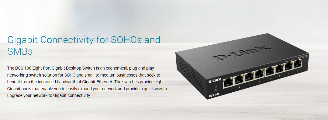 سوئیچ DGS-108 توسط شرکت «دی لینک» روانه بازار شده است. که در واقع یک سوییچ شبکه برای استفادههای نیمه حرفهای است. این سوییچ دارای 8 درگاه LAN از نوع 10/100/1000 مگابیت است. سوییچها ابزارهای بسیار کاربردی برای تهیهی یک شبکهی کامپیوتری هستند که با توجه به امکاناتی که ارائه میکنند به انواع مختلفی تقسیم میشوند.