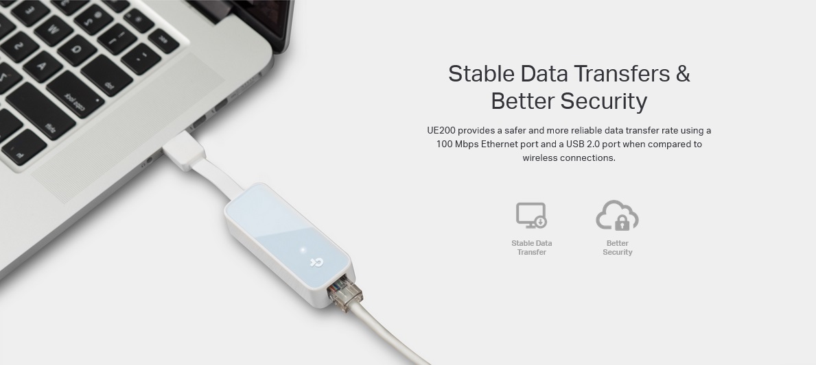 این مبدل کارت شبکه با استفاده از پورت اترنت 100 مگابیت بر ثانیه و پورت USB 2.0 در مقایسه با اتصالات بی سیم، سرعت انتقال داده ایمن تر و مطمئن تر را ارائه می دهد.